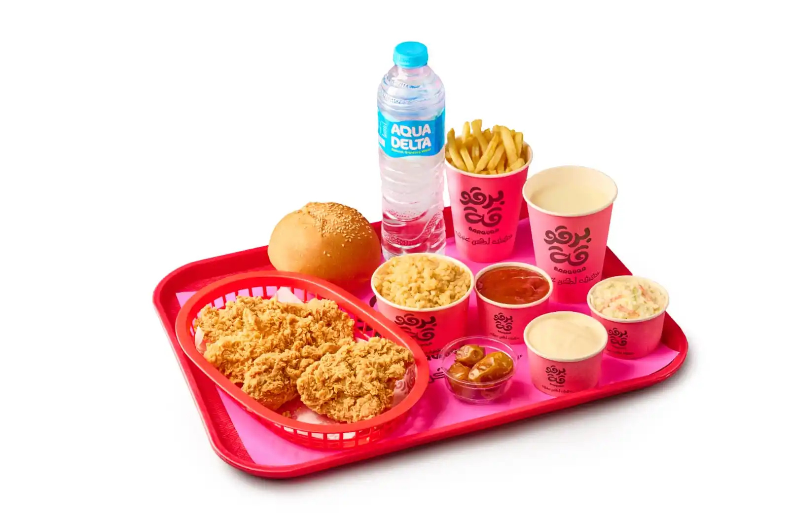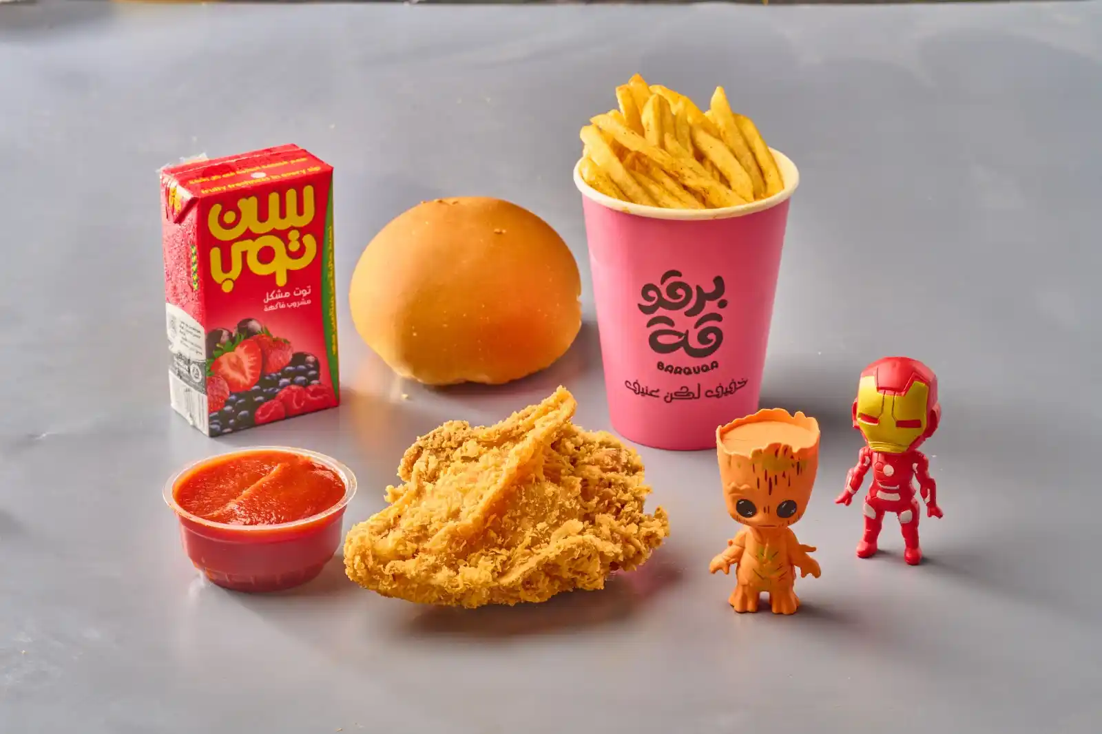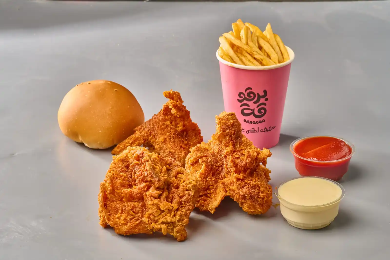 قطعتين بروست + قطعتين ستربس + أرز + بطاطس + خبز + ثومية + كاتشب + كولسلو