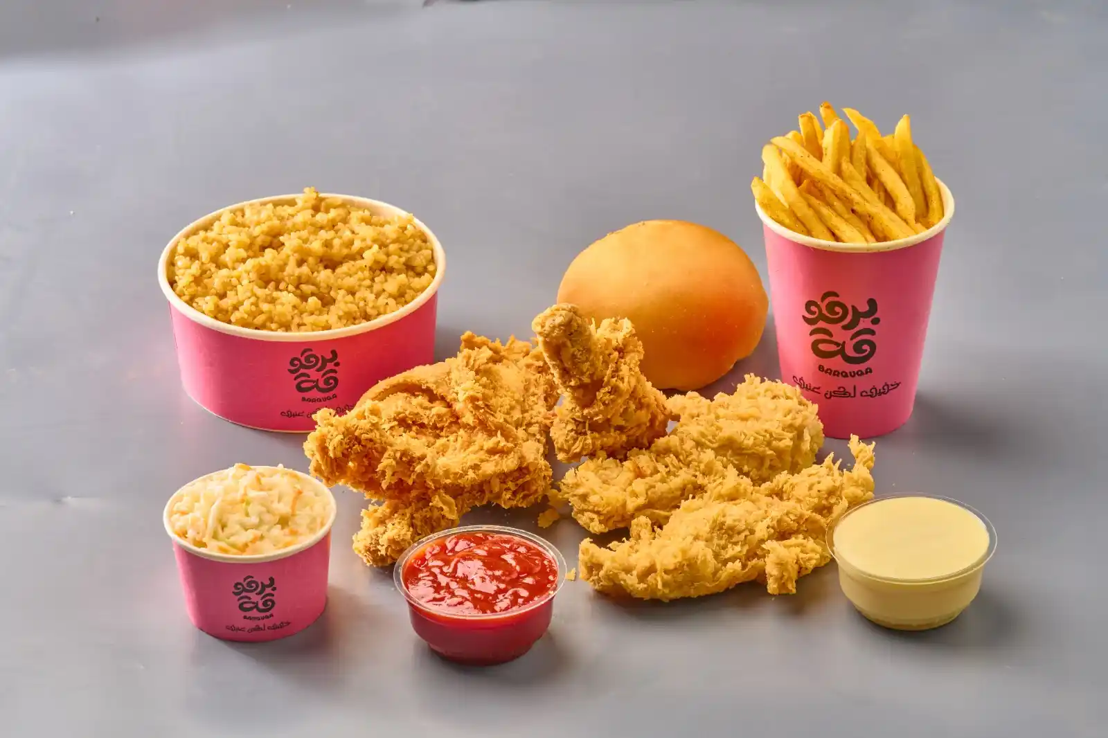 8 قطع بروست + 8 قطع استربس + بطاطس + صوص برقوقة + 5 ثومية + 4 كول سلو + 5 خبز + مشروب عائلي