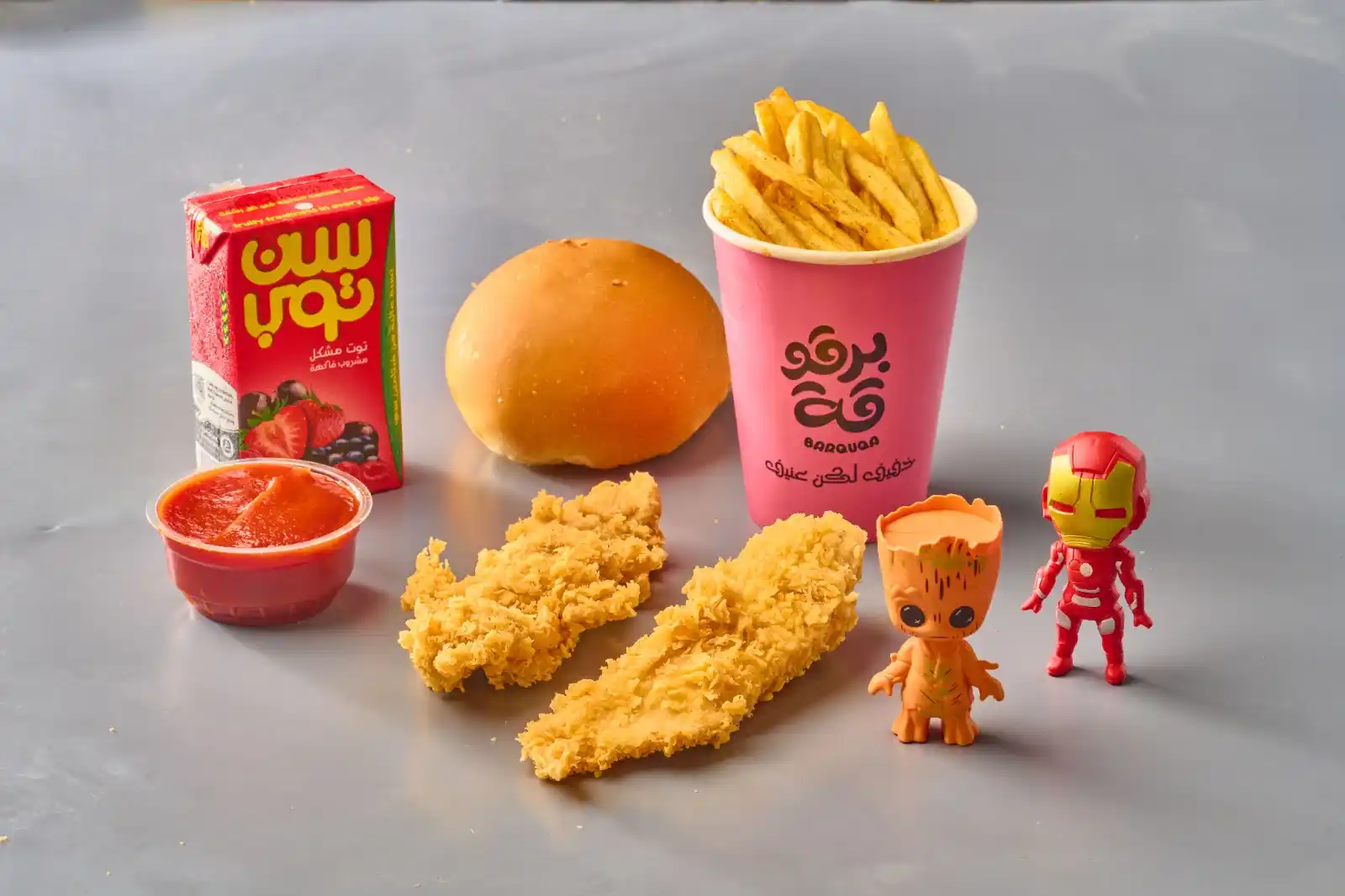 2 قطعة ستريبس + بطاطس + خبز + عصير