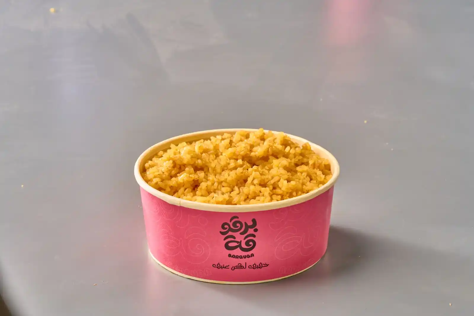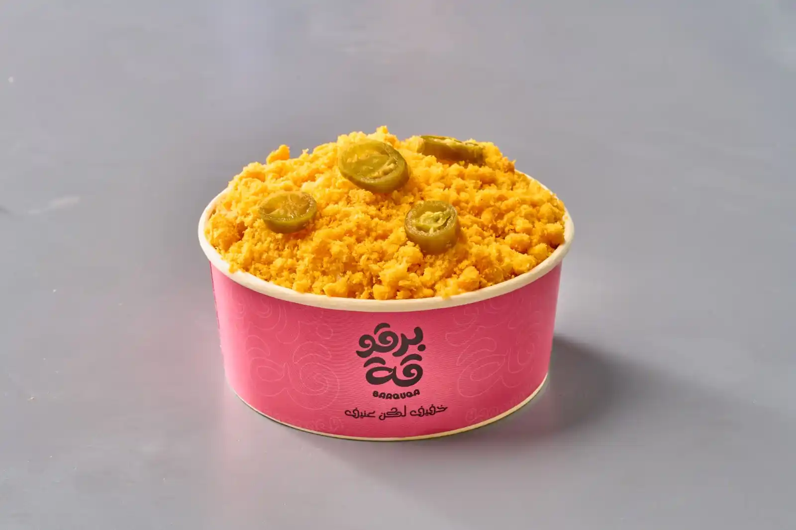أرز بتتبيلة برقوقة الخاصة مع قطع الدجاج المقرمش وصوص برقوقة وصوص جبن وهلابينو