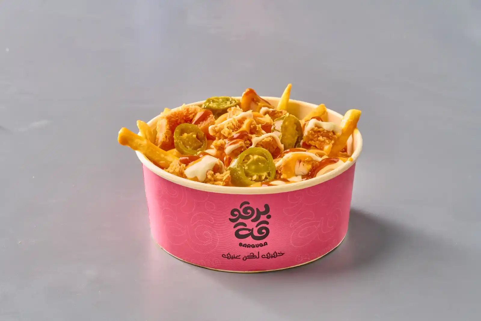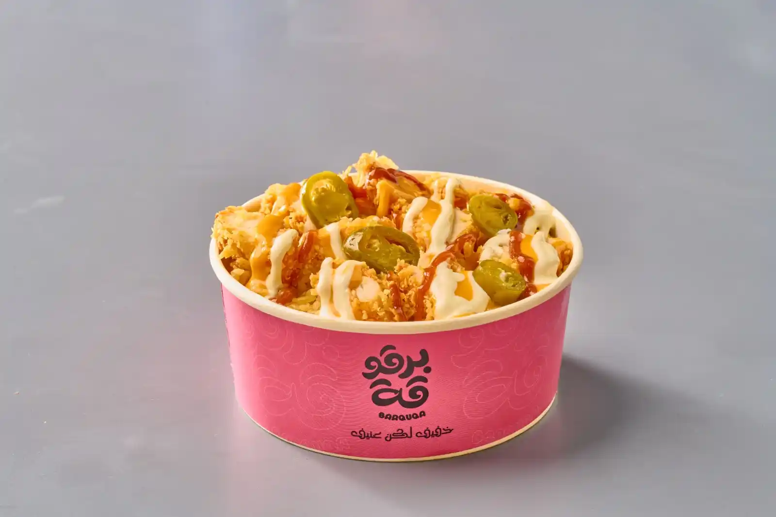 بطاطس بهارات مع قطع الدجاج المقرمش والشيتوس ومكس صوصات وهلابينو