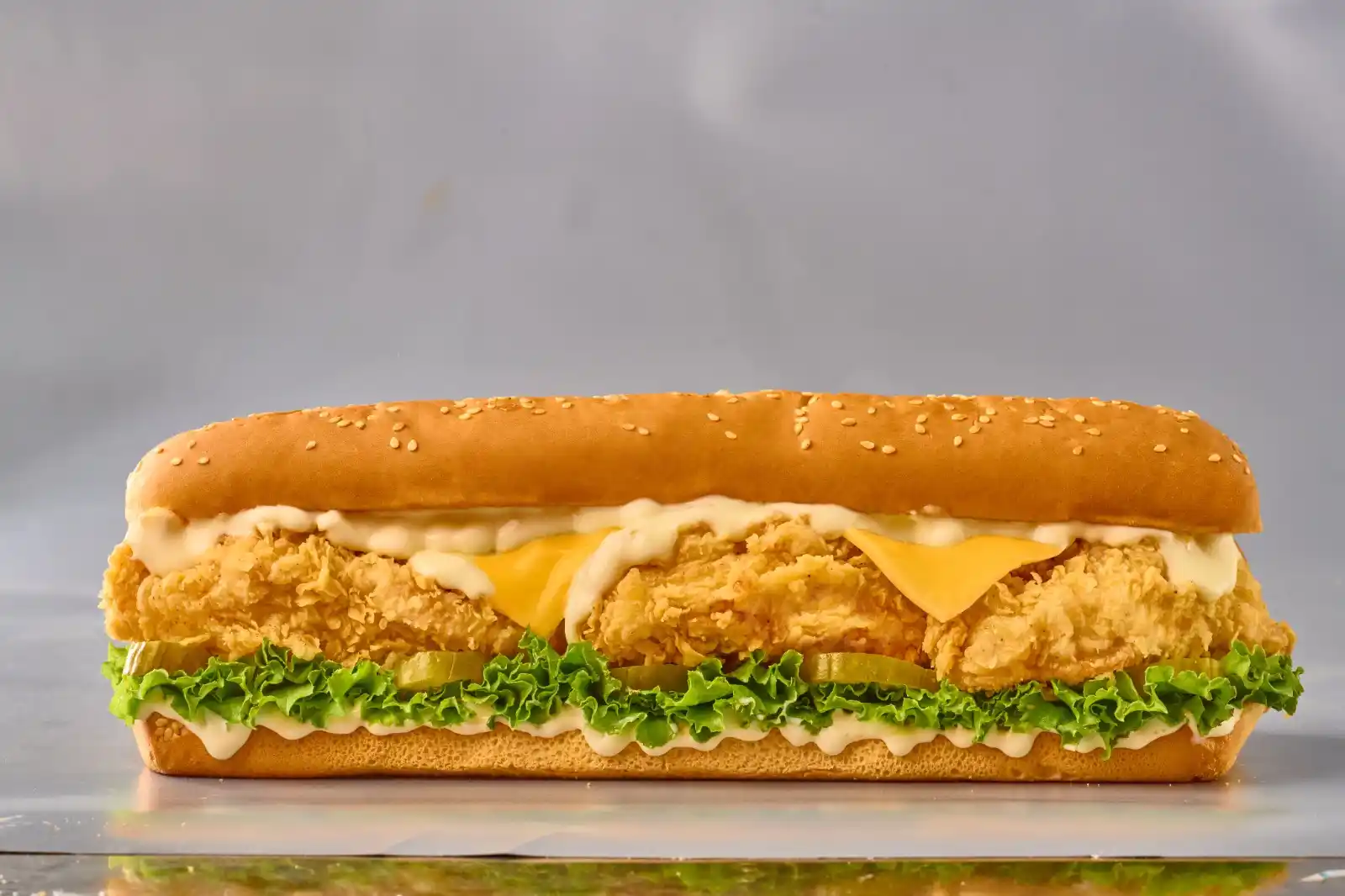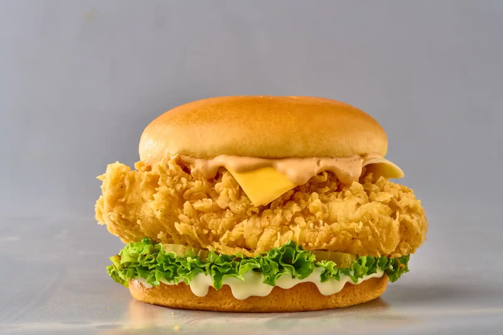 صدر دجاج مقرمش + شريحة جبن + صوص برقوقة الخاص + خس + خيار مخلل