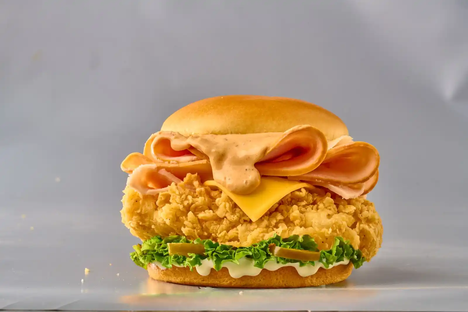 صدر دجاج مقرمش سبايسي + شريحة جبن + تركي مدخن + صوص برقوقة الخاص + خس + شرائح هلابينو